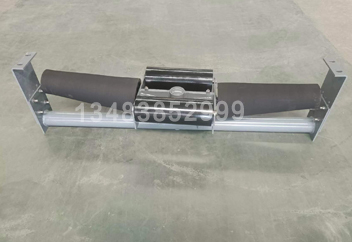 雙中輥調(diào)偏托輥組回轉(zhuǎn)軸焊在下橫梁上,回轉(zhuǎn)總成(包括組合軸承、回轉(zhuǎn)軸套)安裝在下橫梁上方,回轉(zhuǎn)總成外圍設(shè)計了可擺動的中托輥橫梁,以回轉(zhuǎn)軸為中心,在運行膠帶前、后中托輥橫梁上各設(shè)置一個中托輥,形成以回轉(zhuǎn)軸為中心的平衡支撐。側(cè)托輥采用加大軸承和軸徑設(shè)計,用側(cè)托輥軸代替常規(guī)的側(cè)托輥橫梁功能。側(cè)托輥可拆卸的安裝在兩中輥中間。側(cè)托輥為錐形輥設(shè)計,錐形輥采用鑄橡膠結(jié)構(gòu),其在膠帶跑偏時能產(chǎn)生較大的回向阻尼效果,從而使膠帶居中平穩(wěn)運行。